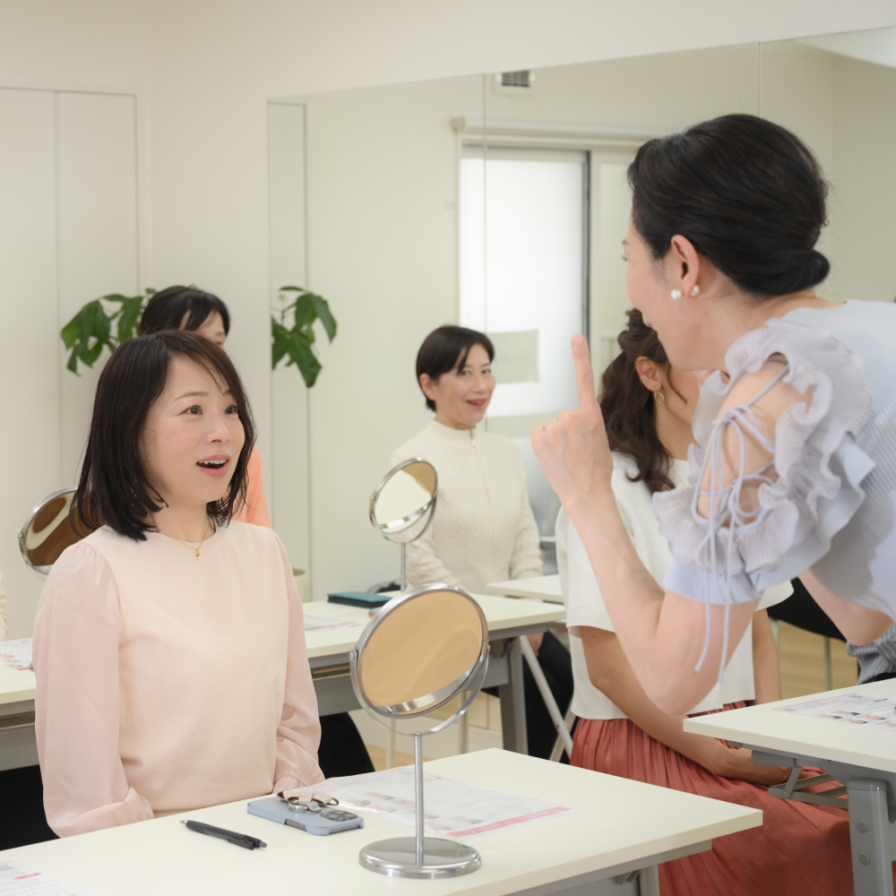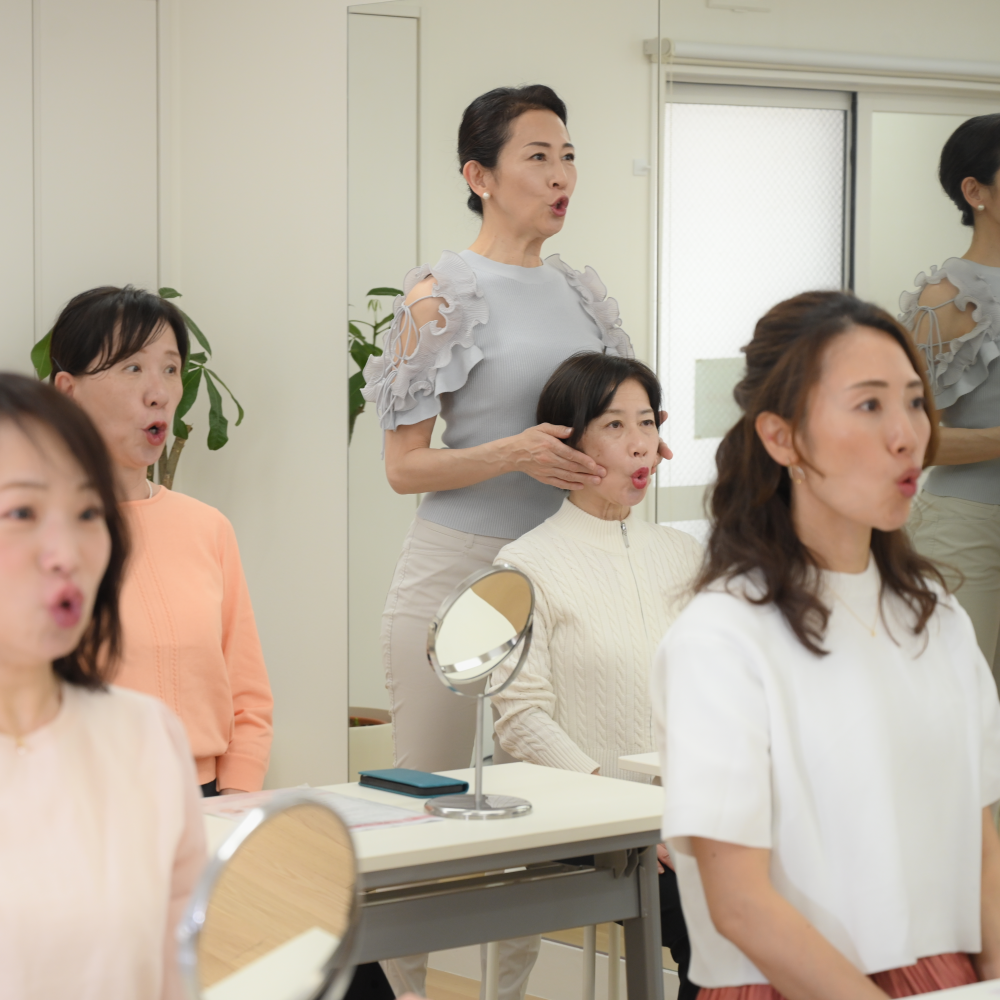 生徒様の表情筋の動かしかたを正確に知るために、講師の小林かおるが、生徒様のお顔に触れる場合もあります。